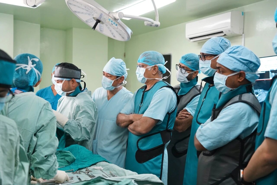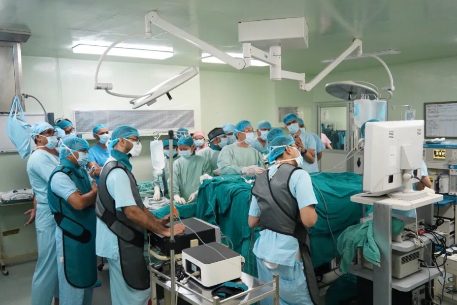 11月21日至23日,浙江大学医学院附属第四医院骨科兼脊柱外科主任胡庆丰率领团队,受邀远赴尼泊尔开展手术演示和学术交流,成功实施南亚首例颈椎双通道内镜(UBE)手术与尼泊尔首例保留黄韧带的腰椎UBE手术,填补当地技术空白,也为当地复杂脊柱疾病的微创治疗提供了新方案。